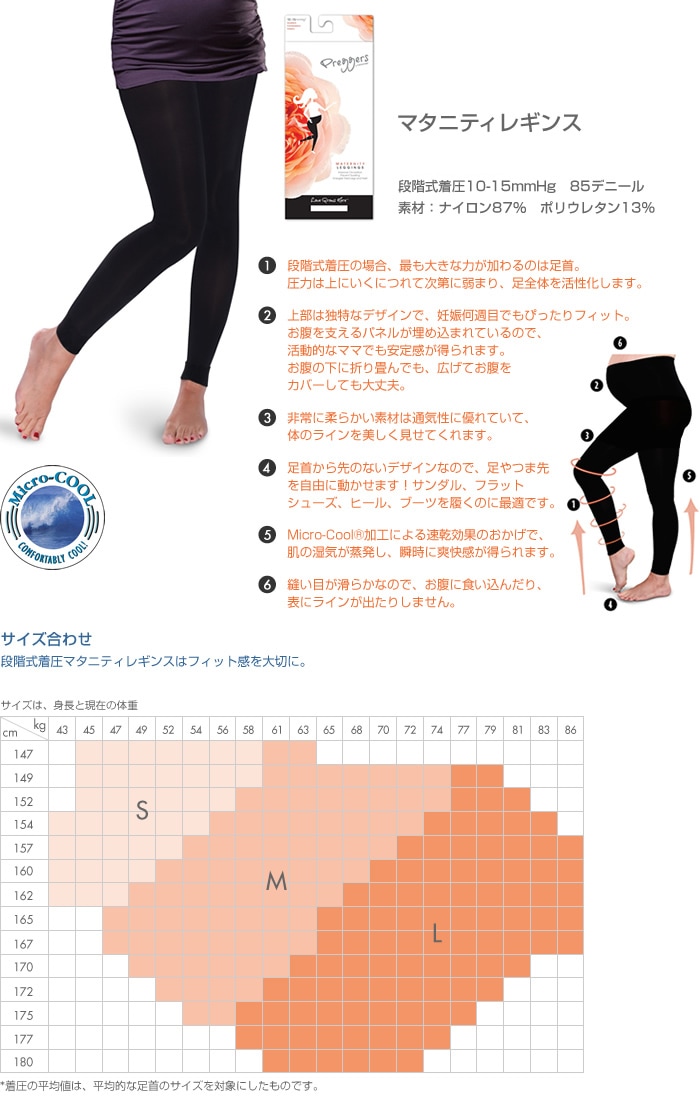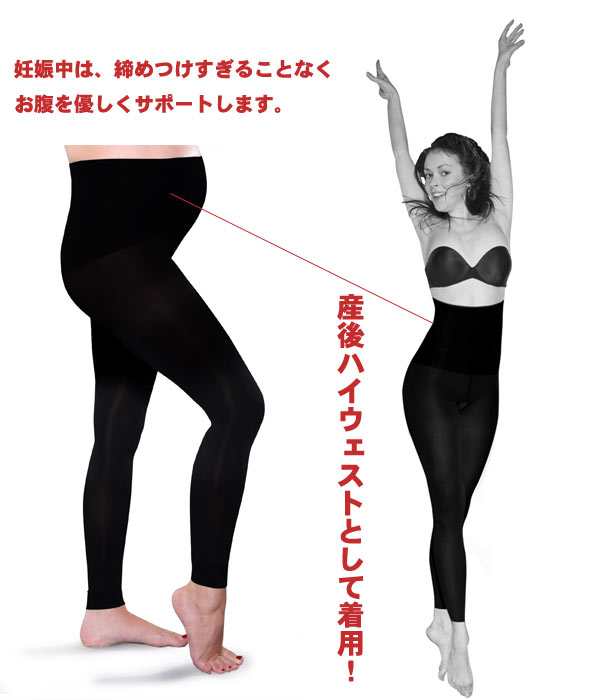 特長:妊娠初期~臨月~産後着用可、ストレッチ素材、着圧機能製品