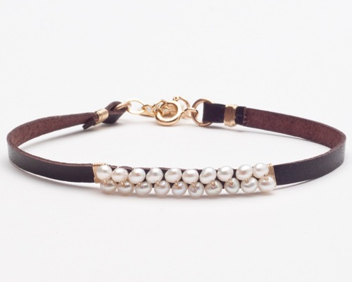 こちらはダークブラウンのレザーに淡水ホワイトパールをビーズにしてデザインしたおしゃれなブレスレットです。
