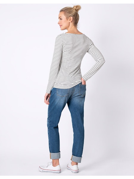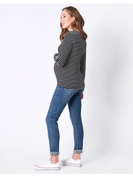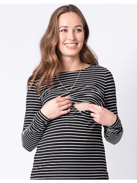 柔らかなリブジャージー素材で作られた セラフィンのAnneトップは、着心地が良く、妊娠中の変化する体型にも優しくフィットします。さらに、可愛い細めの横ボーダーはお腹もすっきり見せてくれます。