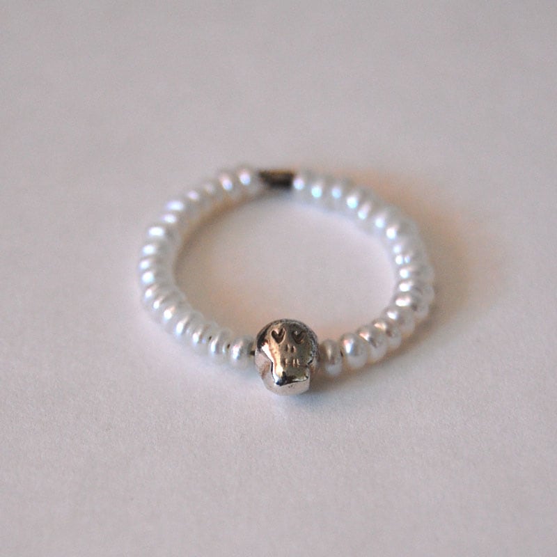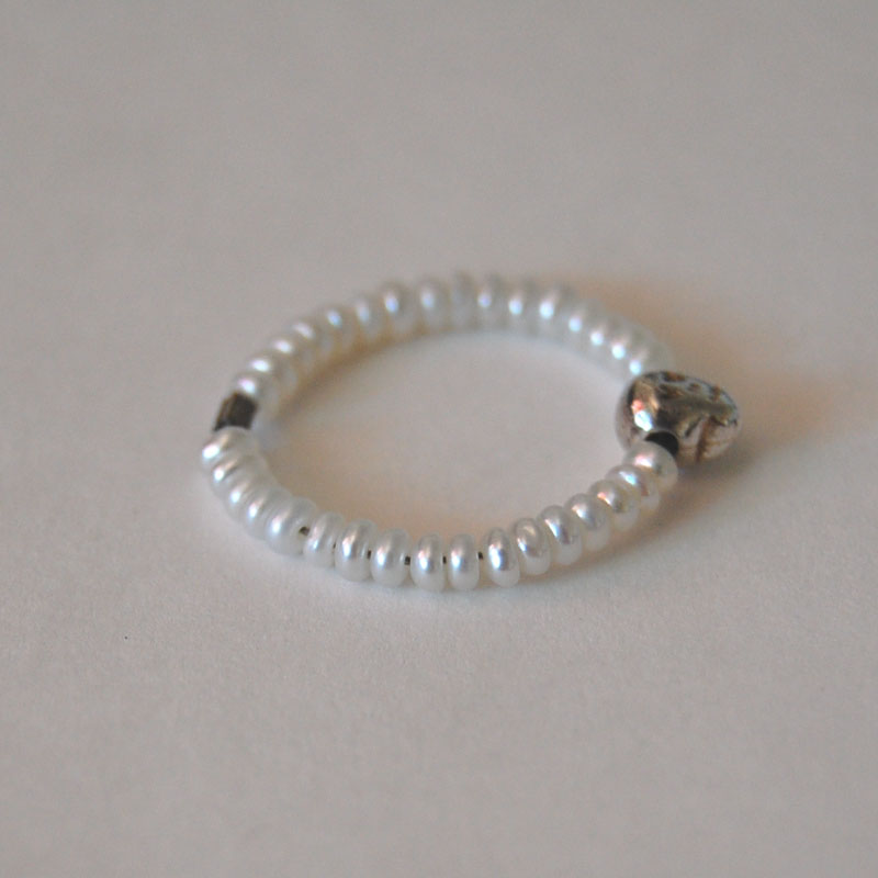 ワイヤーに淡水パールビーズを通したとってもスタイリッシュなリングです。スターリングシルバーを使用したモチーフの小さなスカルは目がハートになっているので、ハードモチーフながらかなり可愛い印象です!